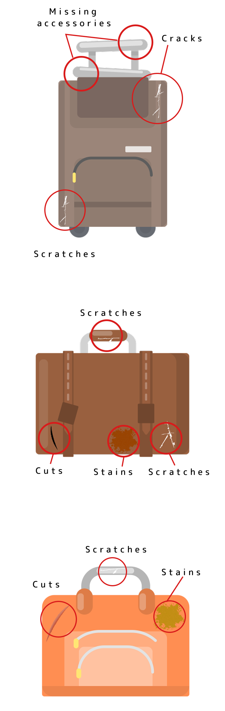 At KBX Co., Ltd., we handle the baggage that we have received from our customers with great care. However, damage may occur due to shaking during delivery. In that case, please note that we will be exempt from liability for the following damages.